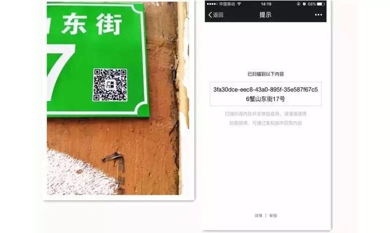 比如快遞物流送貨,掃一下就可自動獲知地址,將來就不需要再填寫地址,而是直接將自己門牌的二維碼發(fā)送過去即可。